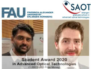 In 2019, FAU published a press release for our development of an advanced optical endoscope for label-free in vivo tissue diagnostics, after publication in ‘Advanced Science’. Now Ashwathama Dilipkumar and Lucas Kreiß, two Doctoral Candidates at the MBT and first authors of this publication, have received the SAOT Student Award for the best scientific publication in the field ‘Optics in Medicine’ by the Erlangen Graduate School in Advanced Optical Technologies. The project is part of an ongoing collaboration between the University Clinics Erlangen (Medicine 1) and the MBT . It is managed by Maximilian Waldner, Sebastian Schürmann and Oliver Friedrich. Currently, the potential of label-free multiphoton imaging is explored for the investigation of Inflammatory Bowel Diseases (IBD) within the collaborative research center TRR-241 between FAU Erlangen-Nürnberg and the Charité in Berlin (see ‚Transregio‘)..